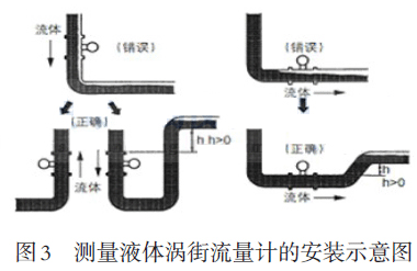 測量液體時為保證測量精確,渦街流量計的管道必須充滿液體。渦街流量計安裝在水平管道上時,應(yīng)將下游段的管道高于渦街流量計,以保持滿管;當流體向下流動時,應(yīng)將下游段的管道高于渦街流量計,以保持滿管。流量計安裝在垂直管道上時,流體應(yīng)該向上流動,當流體向下流動時,應(yīng)將下游段的管道高于渦街流量計,以保持滿管,如圖3所示。