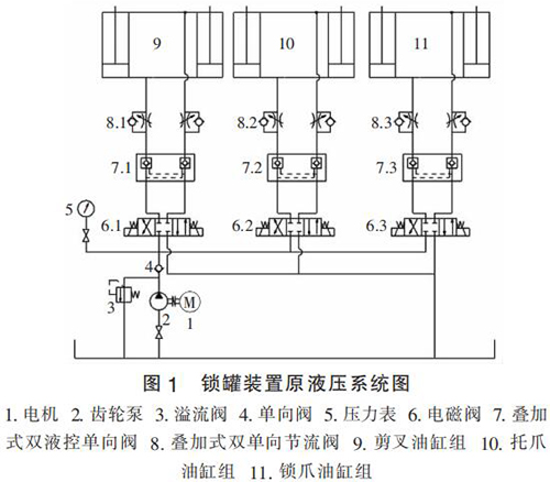 蒸汽管道流量計原液壓系統(tǒng)圖如圖 1 所示。 通過分析圖 1 發(fā)現(xiàn),原液壓系統(tǒng)中剪叉油缸組、托爪油缸組及鎖爪油缸組并聯(lián)安裝,并均由齒輪泵供油,該系統(tǒng)設(shè)計簡單,液壓元件選擇不夠合理,工作效率低,電機發(fā)熱大,主要存在的問題: