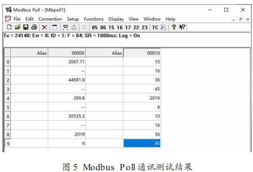 Modbus Poll 通訊測試結(jié)果如圖 5 所示:Tx = 24140,Err =0,ID = 1,F(xiàn) = 04,SR = 1000ms,Log = on。 其中 ,Tx 為Modbus Poll 發(fā)送命令次數(shù),也就是說在測試期間 Modbus Poll軟件共發(fā)送讀輸入寄存器命令 24140 次(發(fā)送間隔為 1s,測試時間為 6.7 小時);Err 為通訊錯誤數(shù),Err = 0 表明 Modbus 通訊模塊正確響應次數(shù)為 24140 次(錯誤數(shù)為 0)。