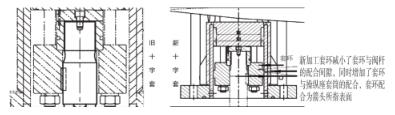 4)優(yōu)化閥桿與閥座的對中性,由于原設(shè)計(jì)結(jié)構(gòu),閥桿與閥座的對中性不易保證,此次加工新導(dǎo)向十字套減小了套環(huán)與閥桿的配合間隙,同時(shí)增加套環(huán)與操縱座套筒的配合,優(yōu)化后的導(dǎo)向十字套結(jié)構(gòu)自身能夠保證閥桿的定位及對中,如圖3。