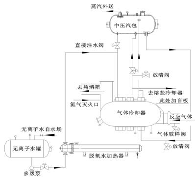 來自無離子水罐的脫氧水經(jīng)多經(jīng)泵加壓、經(jīng)脫氧水加熱器加熱后進(jìn)入到壓縮空氣計(jì)量表的水段,脫氧水與反應(yīng)氣體換熱后分兩路:一路進(jìn)入中壓汽包,保證汽包有穩(wěn)定的液位;一路進(jìn)入熔鹽冷卻器帶出熔鹽攜帶的反應(yīng)熱。來自中壓汽包的高溫水經(jīng)管路接至壓縮空氣計(jì)量表汽段底部,高溫水與反應(yīng)氣體換熱后產(chǎn)生高壓蒸汽,高壓蒸汽又返回中壓汽包。汽包還有一路直接注水管路,此路水不經(jīng)過壓縮空氣計(jì)量表水段,而是直接進(jìn)入汽包。在壓縮空氣計(jì)量表出口溫度偏低而汽包液位也比較低時(shí),可開此直接注水管路來穩(wěn)定汽包液位。其詳細(xì)流程圖如圖 2。