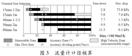 從圖3可見(jiàn),出流量計(jì)口徑為DN80時(shí),*小流量無(wú)法測(cè)量;流量計(jì)口徑縮徑至DN50時(shí),*小流量可測(cè)(此時(shí)流體的雷諾數(shù)非常接近2×104),但此時(shí)的測(cè)量精度稍微差些;流量計(jì)口徑縮徑至DN40時(shí),*小流量可測(cè),且精度也能得到保證。用上述公式計(jì)算的壓損與軟件計(jì)算出來(lái)的也基本一致,差別來(lái)自計(jì)算時(shí)流速及流量計(jì)口徑均采用的是估算值。如果流量計(jì)縮徑至DN25時(shí),流量計(jì)的壓損已經(jīng)達(dá)到7.6kPa,壓損較大,無(wú)法滿足工藝要求。因此選擇DN40口徑的流量計(jì)能滿足要求。對(duì)于DN50口徑的方案,如果流量大于54Nm3/h時(shí),流量計(jì)的精度為此款流量計(jì)的*佳精度,為1.0%,當(dāng)流量為50Nm3/h時(shí),此時(shí)流量可測(cè),只是精度稍差些,約為1.81%,但流量計(jì)的壓損會(huì)小很多,從節(jié)能降耗方面考慮,選擇DN50口徑的流量計(jì)也是可以的。綜上,選擇DN40和DN50口徑的渦街流量計(jì)都能滿足要求。