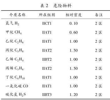 操作溫度為48.9℃,沒(méi)有特殊性,選擇普通的渦街流量計(jì)即可;根據(jù)現(xiàn)場(chǎng)情況,流量計(jì)為露天安裝,防護(hù)等級(jí)選擇IP65即可;根據(jù)《爆炸危險(xiǎn)環(huán)境電力裝置設(shè)計(jì)規(guī)范》GB50058-2014,本裝置中各介質(zhì)所在組別屬于危險(xiǎn)物料,見(jiàn)表2。因此儀表的防爆標(biāo)志選擇ExiaⅡCT4Gb即能滿足要求。根據(jù)項(xiàng)目統(tǒng)一要求輸出信號(hào)選擇為4~20mA+HART。