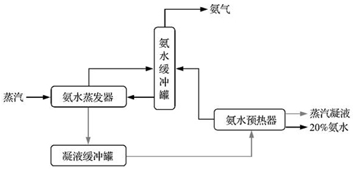 氨水緩沖罐有2個作用,一是進行氣液分離,二是作為氣體緩沖。從智能渦街流量計器來的氨水為氣液兩相,緩沖罐分離出來的氣相進入氨氣/煙氣混合器,與稀釋煙氣混合后送至噴氨格柵。分離出來的液相自流循環(huán)至智能渦街流量計器。氨氣緩沖罐出口管線上裝有壓力控制閥,采用控制氨氣壓力來達到氨氣過熱的目的。氨氣緩沖罐上裝有液位控制系統(tǒng),通過控制加熱蒸汽的流量使緩沖罐內液位穩(wěn)定。當氨水的蒸發(fā)壓力一定,氨水緩沖罐的液位不變時,進入的氨水質量等于蒸發(fā)出的氨氣質量。為了防止氨氣在輸送管道上冷凝,智能渦街流量計在0.1MPa壓力下進行,此時蒸發(fā)溫度為119℃。當氨氣通過罐ding壓力控制閥減壓后,氨氣為過熱狀態(tài),在采取保溫和伴熱措施后保證不會發(fā)生冷凝。氨水緩沖罐為壓力容器,上部裝有安全閥,可防止設備壓力過高。