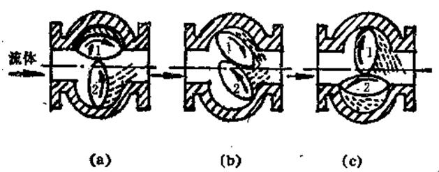 渦街流量計在被測介質(zhì)的壓差△p=pl-p2的作用下,產(chǎn)生作用力矩使其轉(zhuǎn)動。在(a)所示位置時,由于P1>P2,在P1和P2的作用下所產(chǎn)生的合力矩使輪1產(chǎn)生順時針方向轉(zhuǎn)動,把輪1和殼體間的半月形容積內(nèi)的介質(zhì)排至出口,并帶動輪2作逆時針方向轉(zhuǎn)動,這時1為主動輪,2為從動輪,在 (b)上所示為中間位置,1和2均為主動輪;而在(c)上所示位置,P1和P2作用在1輪上的合力矩為零,作用在2輪上的合力矩使2輪作逆時針方向轉(zhuǎn)動,并把已吸入半月形容積內(nèi)的介質(zhì)排至出口,這時2為主動輪,1為從動輪,與 (a)上所示情況剛好相反.如此往復循環(huán),輪1和輪2互相交替地由一個帶動另一個轉(zhuǎn)動,將被測介質(zhì)以半月形容積為單位一次一次地由進口排至出口.顯然,圖上(a)、(b)、(c)所示,僅僅表示橢圓齒輪轉(zhuǎn)動了1/4周的情況,而其所排出的被測介質(zhì)為一個半月形容積.所以,橢圓齒輪每轉(zhuǎn)一周所排比的被測介質(zhì)量為半月形容積的4倍,則通過的體積流量Q為: