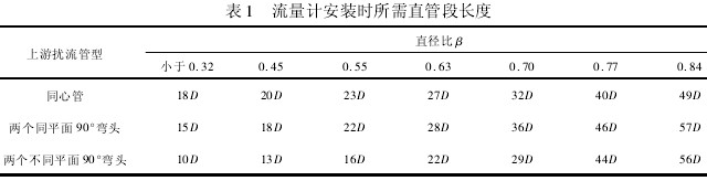 孔板流量計以簡單結(jié)實、成本低廉及無需額外標(biāo)定等優(yōu)勢在工業(yè)中獲得廣泛應(yīng)用。但它也有自身的缺點: 受限于工作原理,量程比限制在3∶ 1~5∶ 1; 在水錘作用下,孔板會變形,如果設(shè)計或安裝不當(dāng)甚至?xí)氯艿? 孔板的直角邊緣在長期運行后會磨損,特別是在進行蒸汽介質(zhì)測量時會改變孔板特性,影響測量精度,因此必須對孔板進行周期檢查并予以更換; 孔板流量計一般需要較長的直管段以保證精度,表 1 給出了不同直徑比β和不同上游擾流布置情況下所建議的直管段長度。