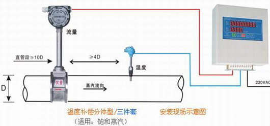 溫度鉑熱電阻和壓力變送器的安裝位置應遵循JJG1029-2007《飽和蒸汽流量計檢定規(guī)程》7.1.1.4和7.1.15要求,溫度測量位置設在流量計下游(2~5)D處(D為管道直徑),壓力測量位置應在流量計下游側(2~7)D處。取壓孔軸線應垂直于測量管軸線直徑為(4~12)mm。溫度鉑熱電阻和壓力變送器的安裝方式應遵循GB50093-2002《自動化儀表工程施工及驗收規(guī)范》4.2、4.3及5.4的要求。壓力取源部件與溫度取源部件在同一管段上時,壓力應安裝在溫度取源部件的上游側。