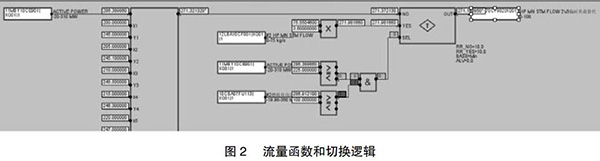 但是由于近期趨勢(shì)可能收集不到部分負(fù)荷段的相關(guān)數(shù)據(jù),在超出現(xiàn)有數(shù)據(jù)負(fù)荷的部分應(yīng)采取必要的補(bǔ)救措施,可以參考相同負(fù)荷運(yùn)行的另一臺(tái)余熱鍋爐的主蒸汽流量,以此來彌補(bǔ)現(xiàn)有數(shù)據(jù)的不足。為了保證數(shù)據(jù)切換的可靠性,切換條件要嚴(yán)謹(jǐn),現(xiàn)有函數(shù)的負(fù)荷下線上增加25MW與另外一臺(tái)的燃機(jī)負(fù)荷大于100MW。如此設(shè)置的好處是當(dāng)另一臺(tái)運(yùn)行機(jī)組突然故障或跳機(jī)時(shí)保證數(shù)據(jù)能及時(shí)切換到函數(shù)輸出,保證機(jī)組的安全運(yùn)行。具體操作見圖2。
